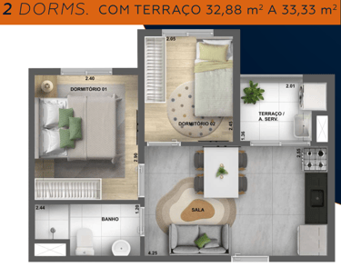 33m2 - 02 Dorms. sem terraço - Finais: 02, 03, 17, 19, 20, 23 e 24 (unidades de meio) e 21 e 22 (ponta)