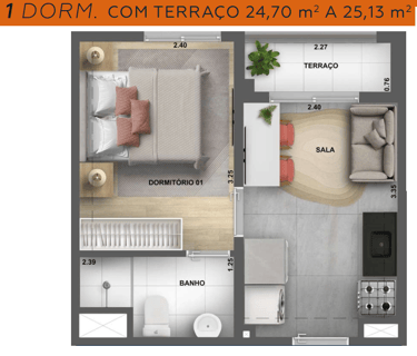 25m2 - 01 Dorms. com terraço – Finais: 01, 09, 16, 17 e 18 (unidades de meio).
