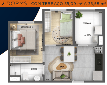 35m2 - 02 Dorms. sem terraço - Finais: 10, 11, 13, 14, 15 e 17 (unidades de meio)