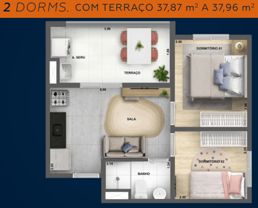 38m2 - 02 Dorms. com terraço - Finais: 05, 06, 12 e 13 (unidades de ponta)