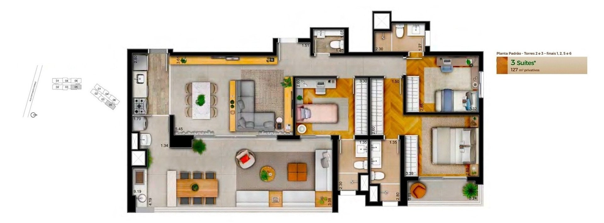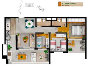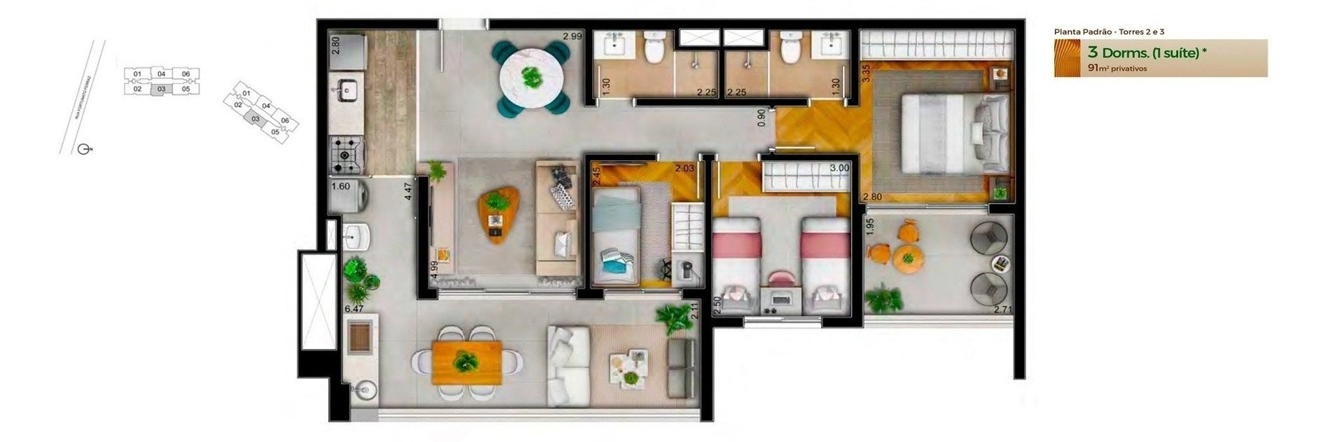 Tipologia das Unidades: 3 dormitórios com 1 a 3 suítes