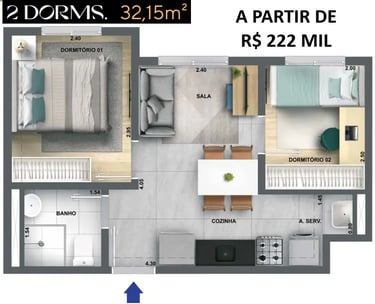32m² - 02 Dorms. sem terraço - (unidades de meio). Finais: 01, 05, 06, 07, 08, 11, 12, 13, 14 e 15.