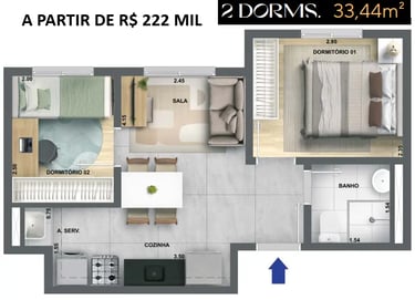 32m² - 02 Dorms. sem terraço - (unid. de meio). Finais: 06, 07, 08, 09, 10 e 11.