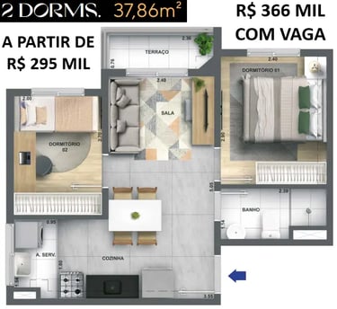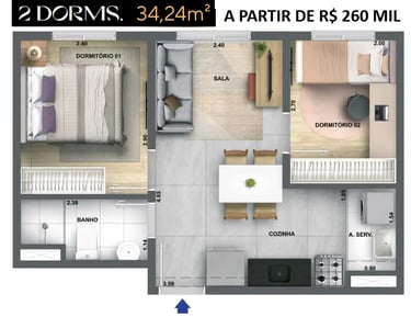 38m² - 02 Dorms. com terraço - (unidades de ponta). Finais: 02, 03, 09 e 10.